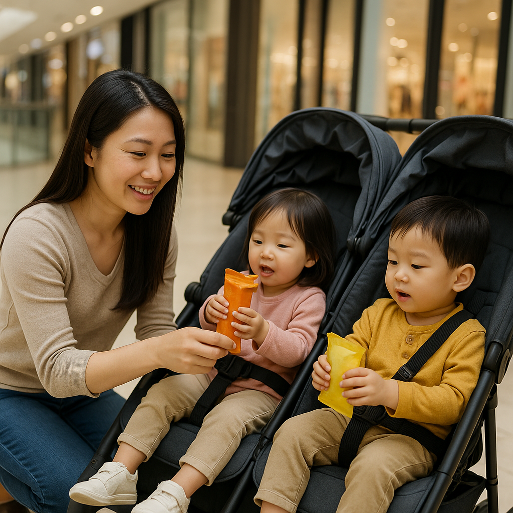 쇼핑몰 안에서 유모차에 앉아있는 쌍둥이 남매에게, 엄마가 밖에서도 먹이기 편한 간식을 각각 뜯어서 주는 모습