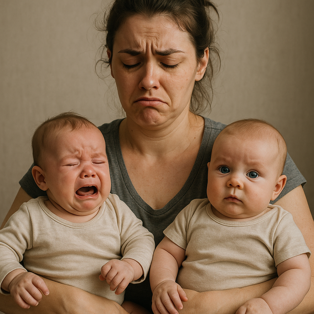 쌍둥이 아기를 양팔에 한명씩 안고 힘들어하는 엄마의 모습
